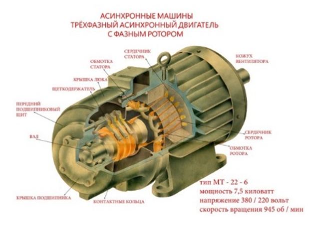 К сети подключается трехфазная обмотка ротора, посредством контактных колец на основном валу и щеток. За основу принимается схема «звезда». На рисунке внизу представлена типичная конструкция такого двигателя.