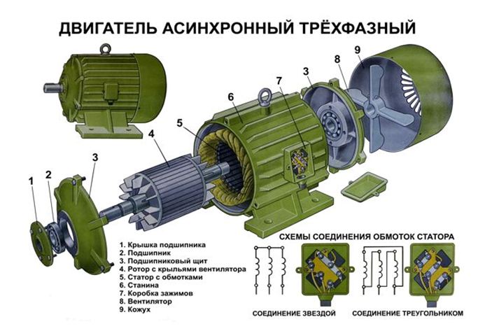Такие электромоторы большей частью используются в производстве. Принцип работы устанавливается по его конструкции – с фазным или короткозамкнутым ротором. Чтобы его запустить не нужна стартовая обмотка, конденсатор или прочие приборы. Пусковой ток, а также мощность достаточно высокие. Применяется в станках, насосах, сельхозтехнике.