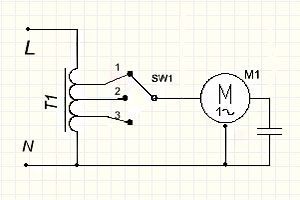 На схеме изображён автотрансформатор T1, переключатель SW1, на который приходят отводы с разным напряжением, и двигатель М1.