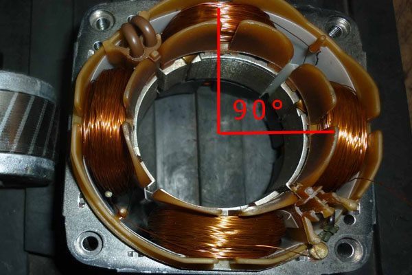 Геометрическое расположение обмоток друг относительно друга в статоре асинхронного двигателя составляет 90°:
