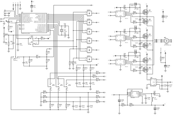 В данной схеме есть две части – одна логическая, где на микросхеме расположен микроконтроллер, а вторая – силовая. В основном такая электрическая схема используется для мощного электрического двигателя.