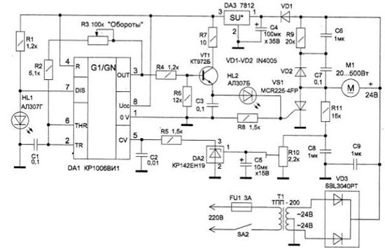 Регулятор оборотов коллекторного двигателя работает от стандартного напряжения в сети. Используется в обычных бытовых приборах.