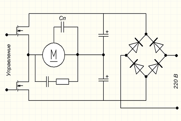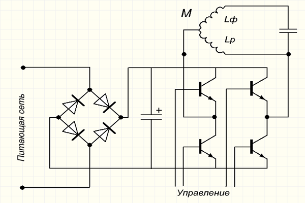 Здесь для подачи постоянного тока и выпрямления требуется генератор управляющего сигнала, усилитель, тиристор, цепь стабилизации оборотов.