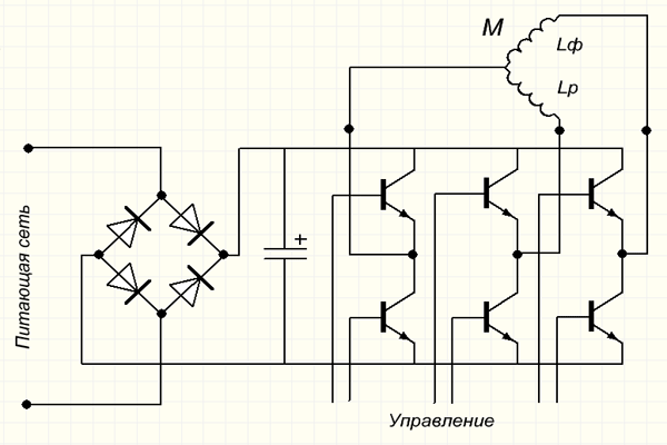 В зависимости от входящего напряжения, частотный регулятор числа оборотов трехфазного или однофазного электродвигателя, происходит выпрямление тока 220 или 380 вольт. Это действие осуществляется при помощи выпрямляющего диода, который расположен на входе энергии. Далее ток проходит фильтрацию при помощи конденсаторов. Далее формируется ШИМ, за это отвечает электросхема. Теперь обмотки асинхронного электродвигателя готовы к передаче импульсного сигнала и их интеграции к нужной синусоиде. Даже у микроэлектродвигателя эти сигналы выдаются, в прямом смысле слова, пачками.