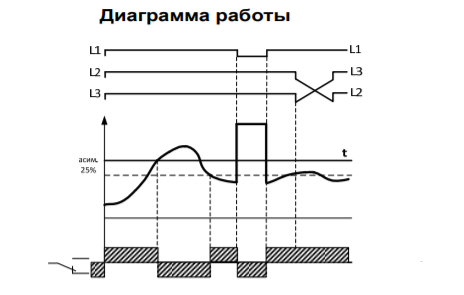 В отличии от предыдущих вариантов клеммы вводов L1, L2, L3 запитываются через предохранители. Блок регулировки параметров позволяет отстраивать соответствующий режим работы и пределы отключения по ним. Два выхода с возможностью ручной коммутации посылают управленческие сигналы на переключение тех или иных устройств.