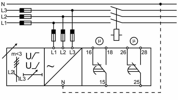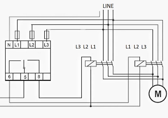 Классическая схема подключения прибора контроля фаз и напряжения в цепь управления трехфазным мотором
