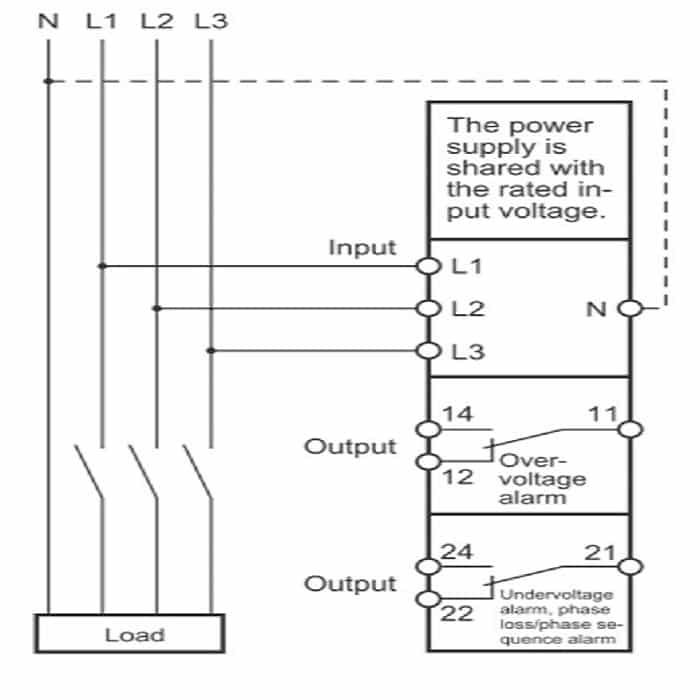 Последние две схемы демонстрируют работу вторичных цепей отключения нагрузки с соответствующей временной задержкой по этим клеммам. Как видите, все схемы подключения имеют идентичные компоненты, предназначенные для отслеживания всех параметров сети, способных сигнализировать сбой в электроснабжении трехфазных потребителей.