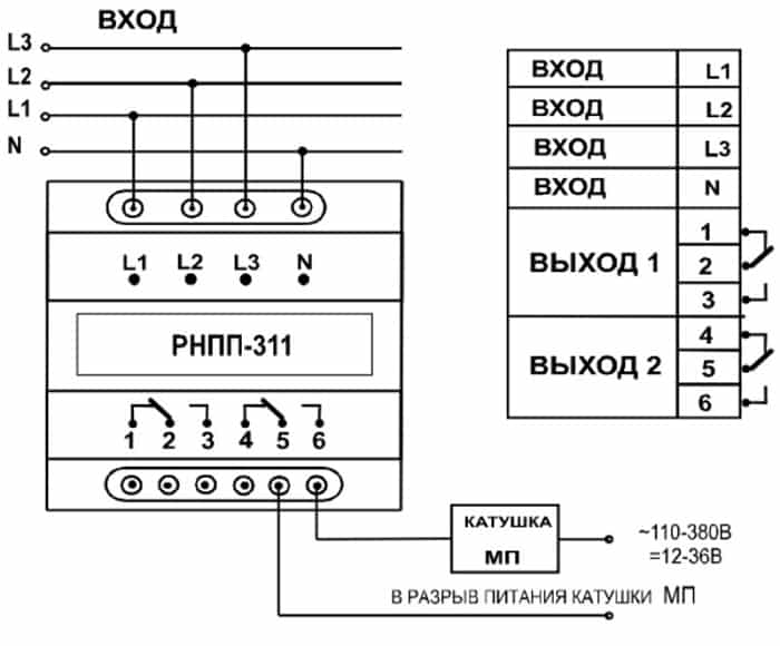 На схеме показано подключение клеммного ряда к соответствующим фазам линии L1, L2, L3 и нейтрале N. На выходе возможно получить две цепи управления «Выход 1» и «Выход 2», отличающиеся по уровням напряжений.