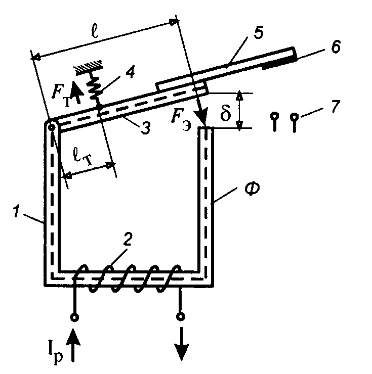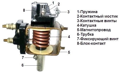 На неподвижной части магнитопровода имеется катушка. А подвижная часть магнитопровода закреплена пружиной, которая противодействует соединению двух частей магнитопровода.