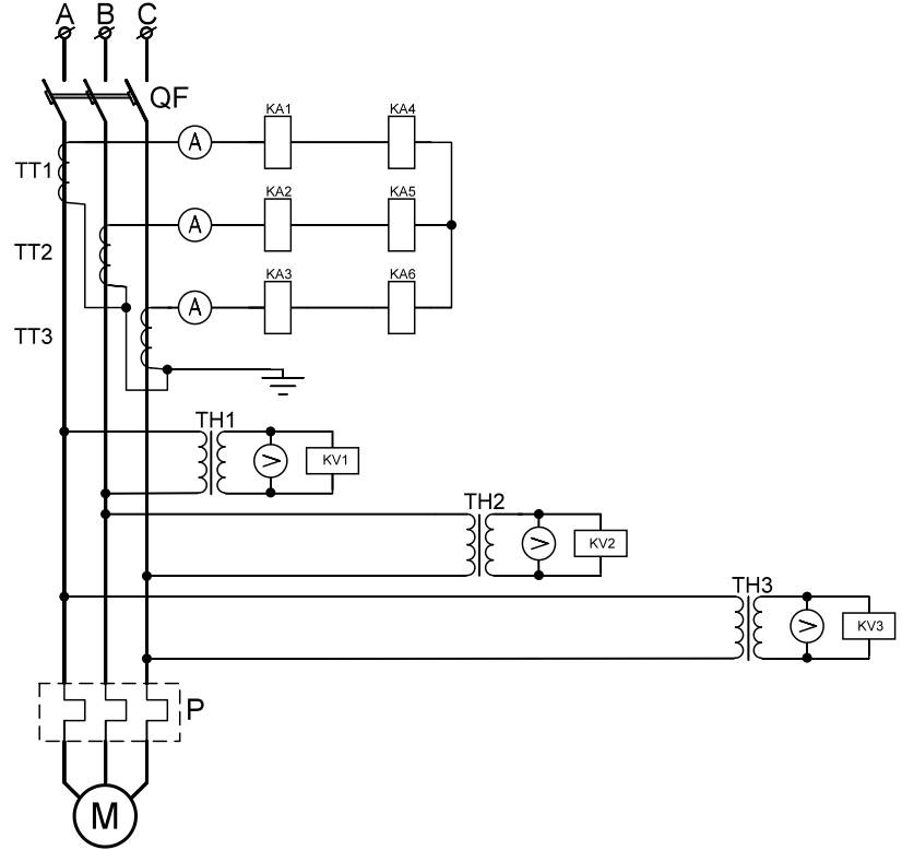 Такие потребители обычно относятся к ответственным, поэтому токовые защиты реализуются по каждой фазе. Принцип подключения прост. Катушка реле просто подключаются к выводам трансформатора тока.