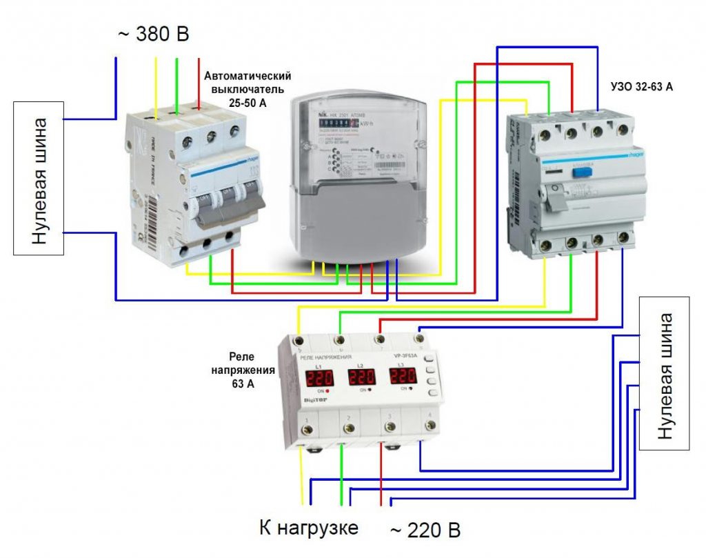 Отличия существуют и в мощности потребителей, которые подключаются через РН. Одним достаточно для питания фазы и нуля. Другие требуют трехфазное питание. Для каждой категории мощности нагрузки необходима соответствующая схема подключения реле. Поэтому принято выделять 3 способа включения этих защитных устройств: