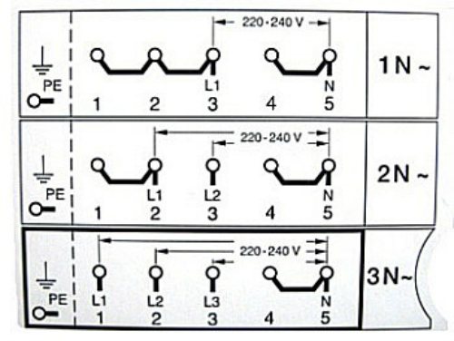 Подобная схема чаще всего применяется в частных домах, но можно ее применить и в квартире, когда проводка состоит из провода с четырьмя жилами. В этом случае перемычку ставим между винтом №1 и L1, вторую — винты N4 и N5, а винт L2 и для заземления остается свободным (см. схема 2N). Как правильно подсоединить провода, показано на фото: