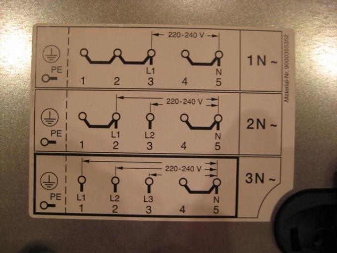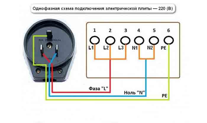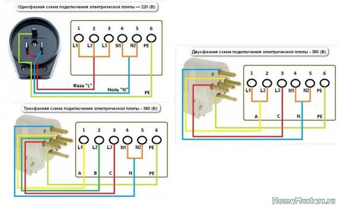 Стандартные схемы подключения не зависят от выбранного вами способа подсоединения техники к домашней сети и бывают трех видов: одно-, двух- или трехфазными. Если ваша плита рассчитана на 220В, то надо использовать первый вариант, а если на 380В, то применяются второй и третий варианты.