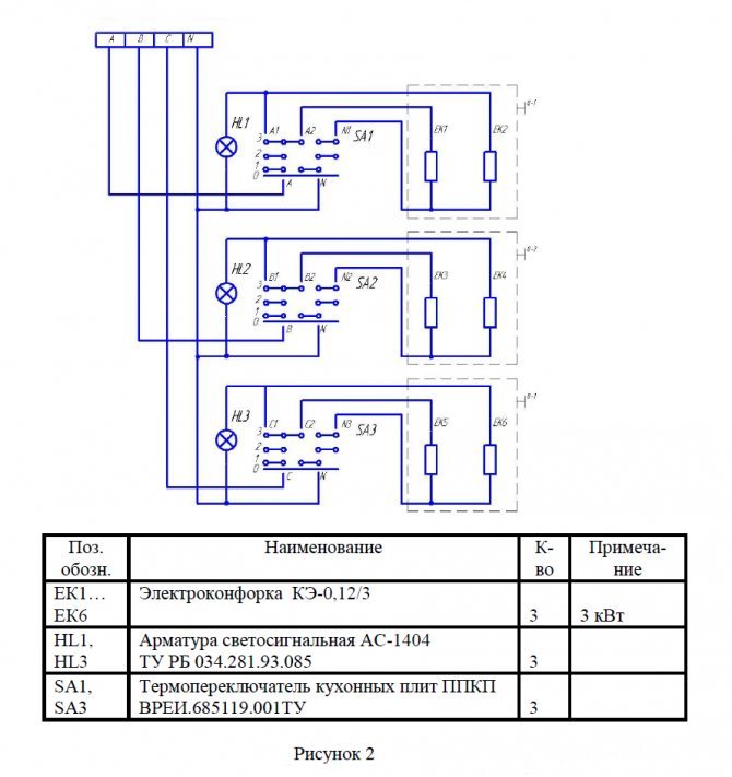 Двухфазное подключение (рис. 2) используется достаточно редко и может быть выполнено лишь в жилых помещениях при наличии в них трехфазной сети. При этом электроконфорки будут подключены к двум фазным проводам, а одна фаза останется незагруженной.