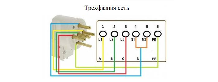 - фаза A — провод желтого цвета подключается к контакту L1;