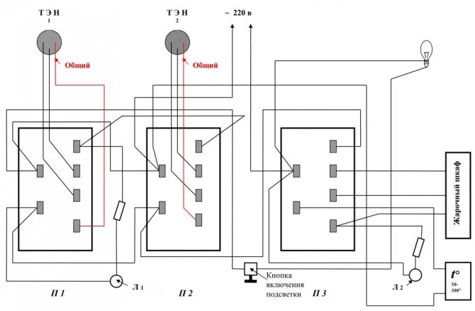 Далее, необходимо заменить переключатель мощности конфорки. К каким именно выводам контактам переключателя мощности — нужно подсоединить провода? Как правильно подключить конфорку к проводам? Как правильно соединить между собой два нагревательных элемента верхний и нижний ТЭНы духовки? Как правильно соединить два ТЭНа духовки в электрической схеме?