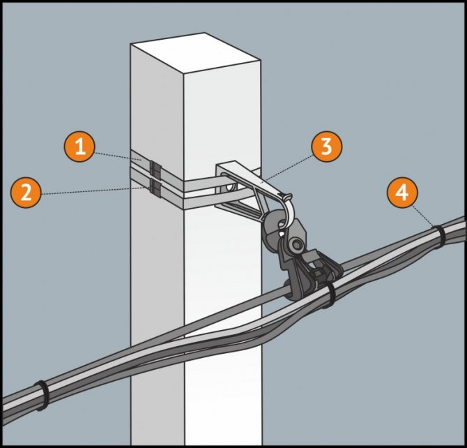 Внимание! Если производится прокладка новой трассы, то металлические крепежные изделия должны быть прикреплены на опорах еще до их установки. Это упрощает сам процесс крепления, ведь наверху это сделать будет непросто. Во всяком случае, для этого потребуется спецтехника или придется электрикам использовать когти.