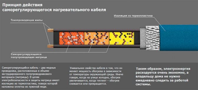 Лучшими техническими параметрами обладает саморегулирующийся провод. Его состав и способ действия совершенно непохожи на принцип действия описанных выше кабелей. Этот провод имеет в своём составе две токопроводящие жилы, которые контактируют с матрицей, выполненной из специального полимерного материала. За счёт этого полупроводникового устройства происходит регулировка нагрева. Когда температура повышается, проводимость полупроводника понижается, за счёт чего сокращается мощность теплоотдачи. С внешней стороны матрица покрыта изолирующими материалами, между ними располагается специальная экранирующая оплётка.