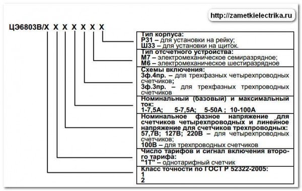 На лицевой панели счётчика видно, в соответствии с какими стандартами выпускается ЦЭ прибор. Это ГОСТ Р 52320-2005 и ГОСТ Р 52322-2005. Маркировка содержит в себе информацию о технических условиях эксплуатации. Чтобы понять кодировку, необходимо расшифровать ряд знаков. Например, на лицевой панели и в паспорте счётчика указана маркировка следующего содержания – ЦЭ6803в/1 1Т 220в 1-7,5А 3ф.4пр. М6 Ш33: