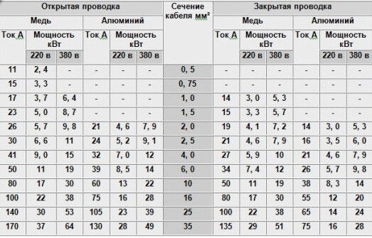Номинал автомата для цепи подбирают не только путем расчета, но и по такой таблице, ориентируясь на разрез кабелей в схеме
