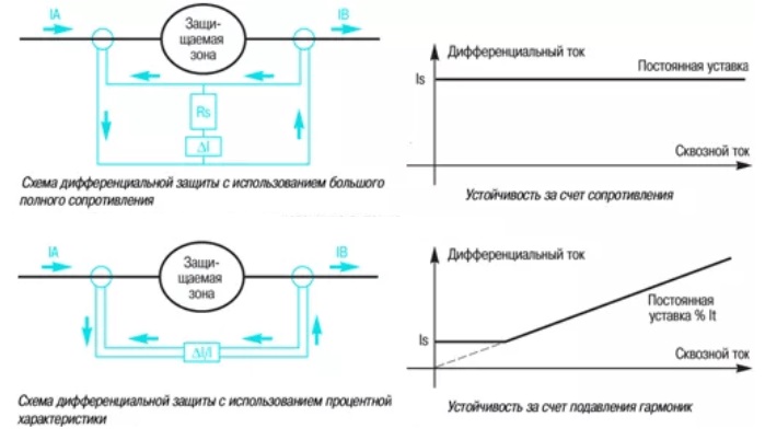 Дифференцируемая система сравнивает отклонения параметров в начале линии питания, и непосредственно у агрегата. Если отклонения достигают заданной величины — ситуация признается аварийной. Такая селективность требуется, если питание подается на очень мощные агрегаты.