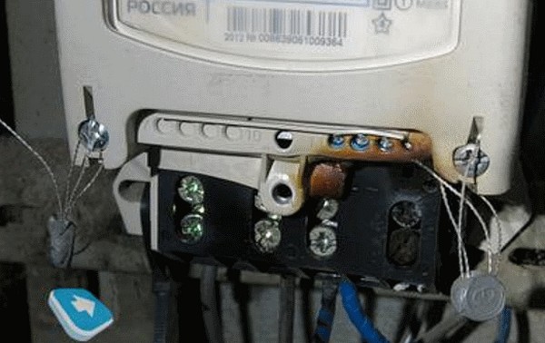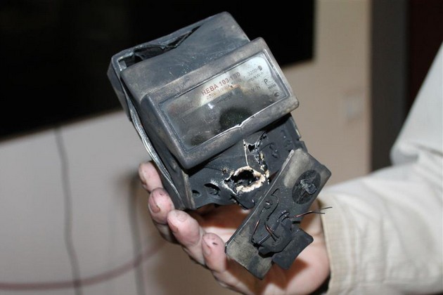 1. Счетчик электрической энергии сгорел. Корпус прибора и контакты оплавлены, чувствуется запах гари. Выгорели электрические провода, подведенные к электросчетчику. В этом случае устройство невозможно отремонтировать и оно подлежит полной замене.
