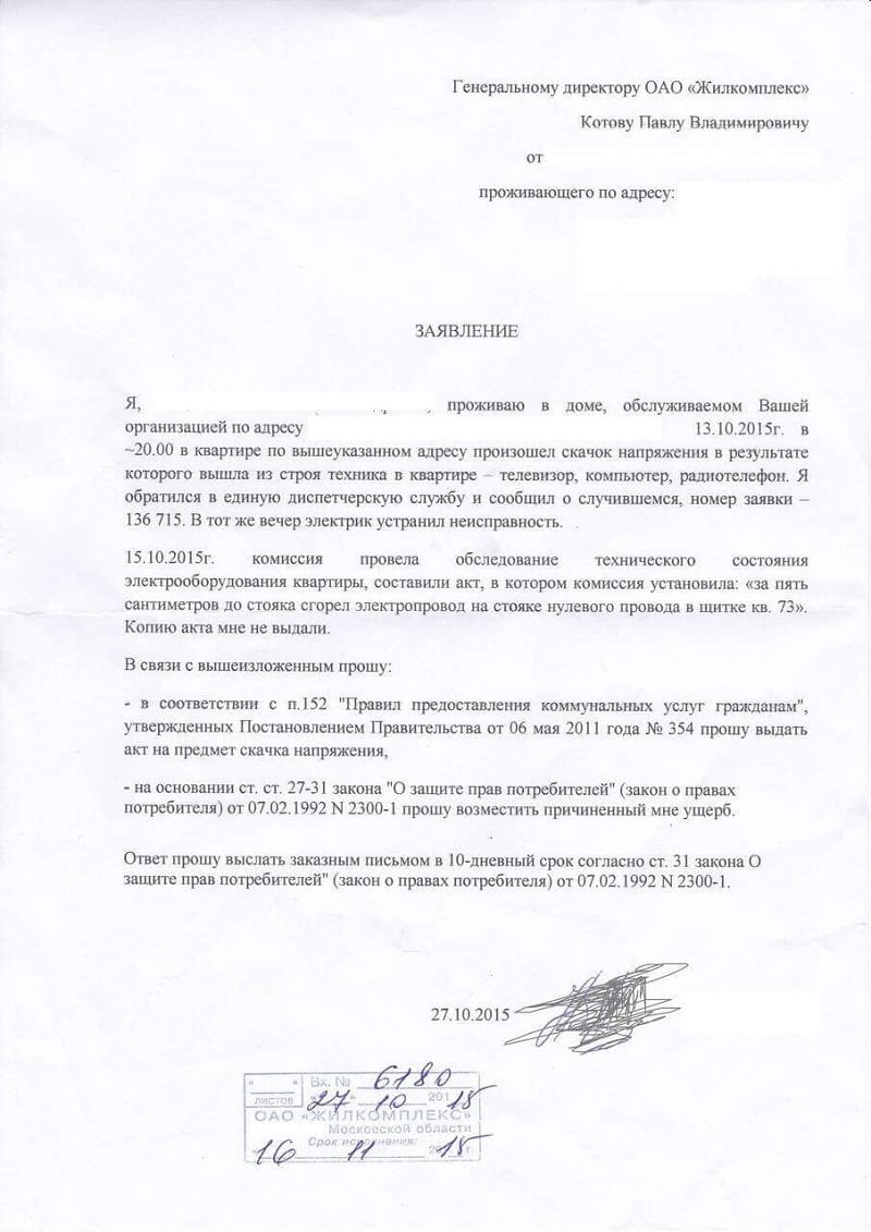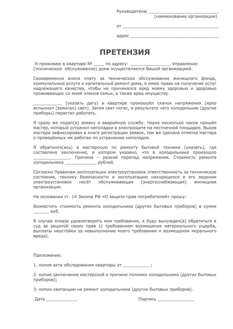 После того, как заявление написано и отправлено, следует составить письменную претензию управляющей компании. Основание для данной претензии – подача электроэнергии ненадлежащего качества. Но в общем документ составляют по причине некачественного оказания услуг.