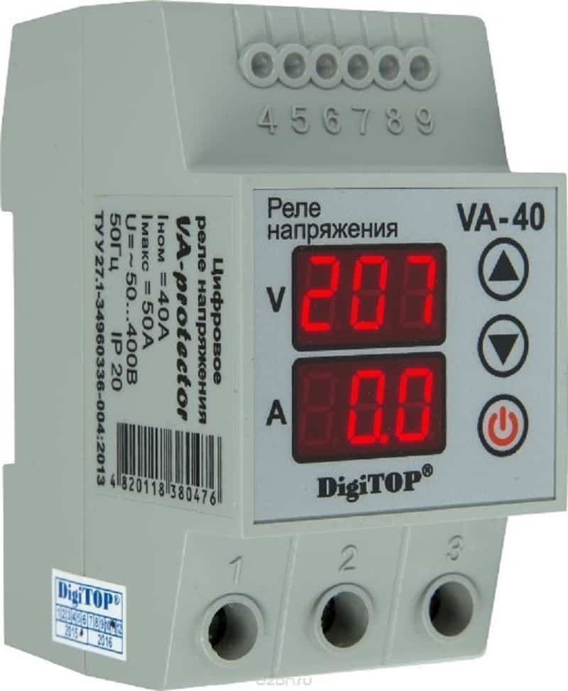 Реле напряжения. Устанавливается на входящую фазу и отключает бытовую технику при отклонении от нормы – 220 В, 50 Гц. Также существуют реле напряжения, рассчитанные на потребителей повышенной мощности. Для включения таких устройств защиты монтируется дополнительный магнитный пускатель. Реле напряжения