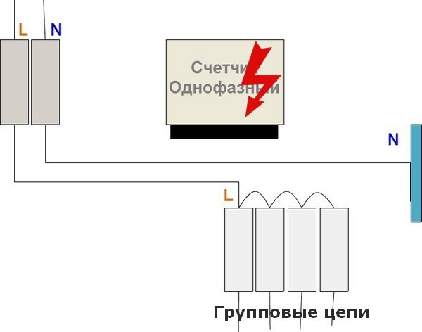 Фазный провод на выходе вводного автомата подключаем к автоматам защиты групповых цепей квартиры, вместо фазного провода от счетчика.