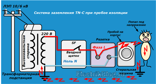 Система заземления TN-C все еще действует в большинстве жилых зданий нашего государства. Ее опасность состоит в том, что при пробое изоляции бытового прибора, например, стиральной машины опасный потенциал фазы проникает на корпус и никуда не стекает.
