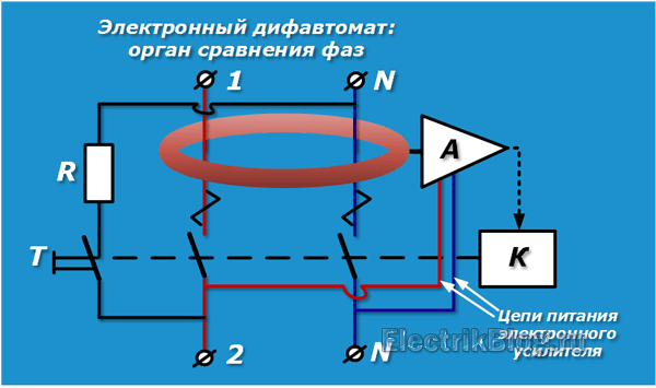 УЗО предназначено для сравнения величины электрического тока, протекающего в фазном и нулевом проводе. При нормальной работе электрических приборов эта величина одинакова и встречные потоки в обмотках УЗО компенсируют друг друга. Как только возникает аварийная ситуация — где-то нарушается изоляция с последующим протеканием заряженных частиц на землю в обход нуля, дифференциальные токи будут отличаться и защита отключит питание.