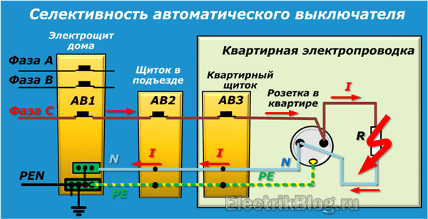 Например, если не справился со своей задачей АВ3 квартирного щитка, показанный на картинке, то его работу страхует очередной прибор: АВ2 щитка в подъезде.