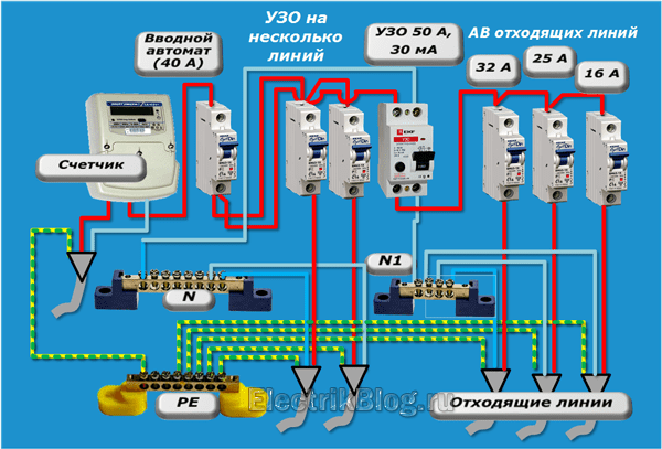 Вводное трехфазное УЗО + отдельные групповые