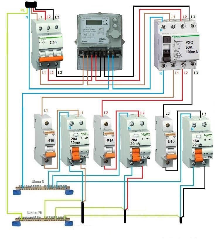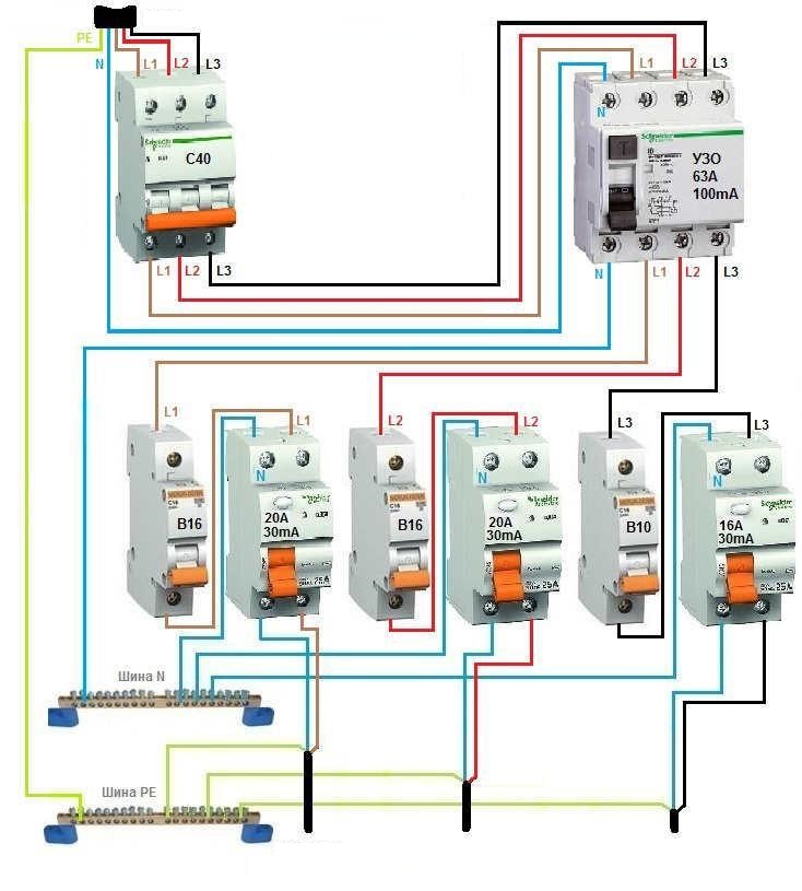 После вводного трехфазного УЗО провода следуют на групповые автоматы. Нулевая жила подключается на общую N шину. В идеале она имеет голубой цвет. Затем фазные провода с автоматов подключаются на однополюсные групповые УЗО и расходятся по потребителям.