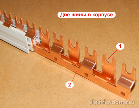 У двухполюсной гребенки на каждой шине расстояние между зубьями будет больше, нежели у однополюсной. Это связано с тем, для подключения к этим гребенкам подводится два питающих провода, фаза — нуль (L+N) или фаза — фаза (L1+ L2) и зубья на каждой шине должны идти как бы через один.