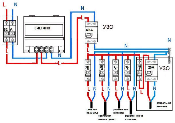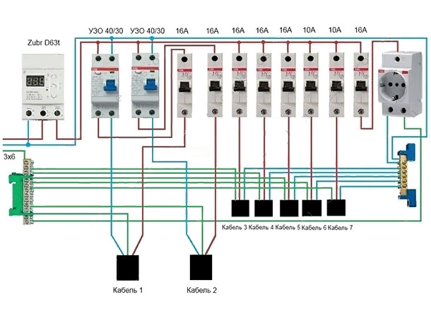В данной схеме УЗО и защитные автоматы рекомендуется разместить на одной дин-рейке и соединить на входе четырехполюсной шиной.