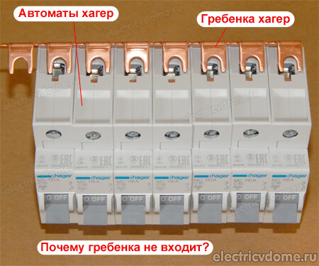 Как видно из фото в автоматические выключатели хагер шина с вилкообразными контактами не входит в обычные зажимы (ровно как и в любой автомат другой фирмы). Вот незадача, шина и автоматы одной фирмы, а контакты не подходят, почему? Вопрос на засыпку! 🙂