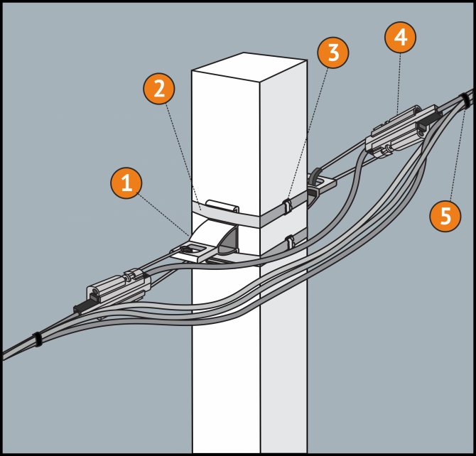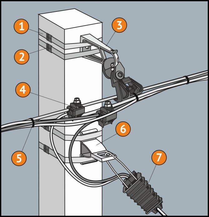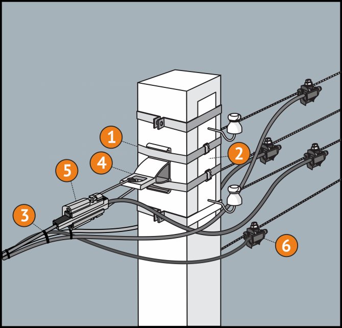 2 – край оболочки, срезанной с конца СИП; 3 – алюминиевые провода СИП; 4 – изолированная гильза для абонентских ответвлений; 5 – герметизирующая цветная заглушка; 6 – медная многопроволочная изолированная жила |