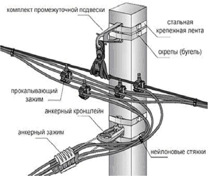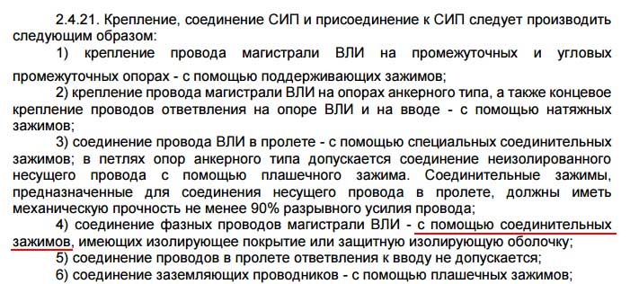 Например, СИП 4 не допускается соединять между собой в пролётах. Такой провод СИП допускается соединять, только используя опору, чтобы на жилы провода не осуществлялась нагрузка.