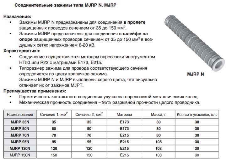 Технические характеристики соединительных зажимов (гильз) MJPT N