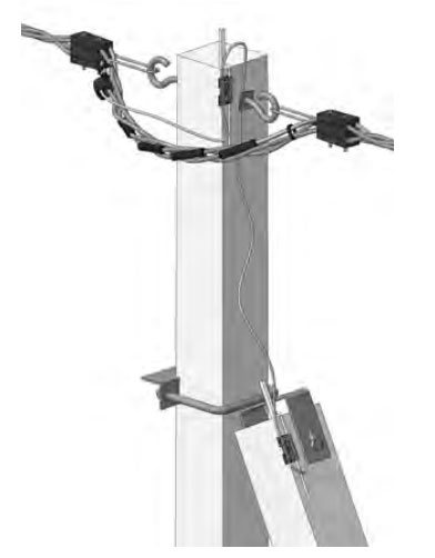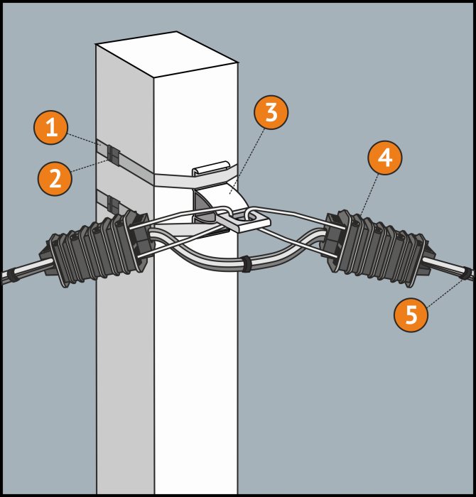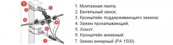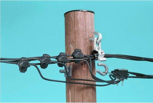 - Прокалывающие зажимы. Для соединения жил и создания ответвлений от магистральной линии на несущем столбе используются те же прокалывающие зажимы, что и для соединения медных и алюминиевых проводников, так как они не создают гальванической пары между разнородными металлами и контакт не подвергается разрушению. Монтаж прокалывающих зажимов на магистральную линию достаточно прост и выполнять его можно без отключения энергоснабжения, но с соблюдением всех правил техники безопасности. На первом этапе жилы магистрали разделяются специальными пластиковыми разделительными клиньями и на них устанавливаются и затягиваются зажимы. Далее концы ответвлений также зажимаются в соответствующем гнезде зажима и на них одеваются защитные колпачки. Линия ответвления должна быть закреплена на столбе анкерными удерживающими устройствами.