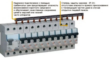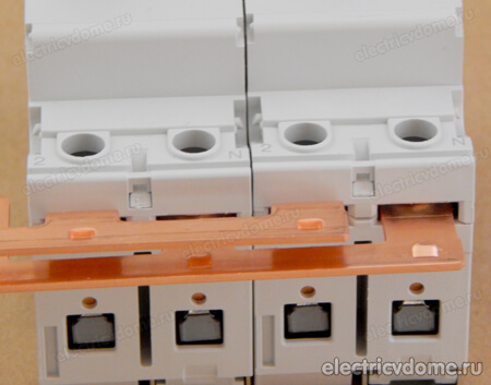 Каждый полюс укладывается в отдельный паз корпуса и оказывается надежно изолированным от других токопроводящих шин. С помощью шины-гребенки можно соединять как однополюсные автоматические выключатели, так и трехфазные УЗО.