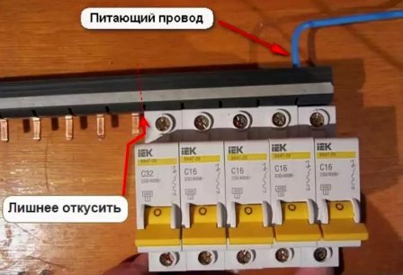 После того, как подходящая длина будет отрезана, переходим к подключению автоматических выключателей гребенкой. Здесь все просто, шину нужно разместить вверху, вставить штыревые отводы в соответствующие разъемы и затянуть винты. В один из зажимов, крайний, нужно подключить вводной питающий провод.