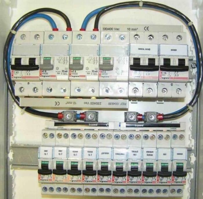 - Разводка проводки в щите с применением распределительной шины выглядит более аккуратной, что видно на фото ниже: