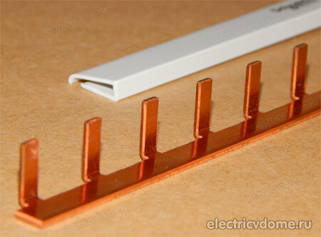 Давайте более подробно рассмотрим, как выглядит соединительная шина гребенка для автоматов. Однополюсная гребенка имеет форму прямоугольной медной пластины, которая расположена в корпусе. Корпус изготавливается из огнеупорного пластика. Вдоль пластины с определенным шагом расположены ответвления — зубьями, к которым подключаются электрические автоматы, УЗО, дифавтоматы.