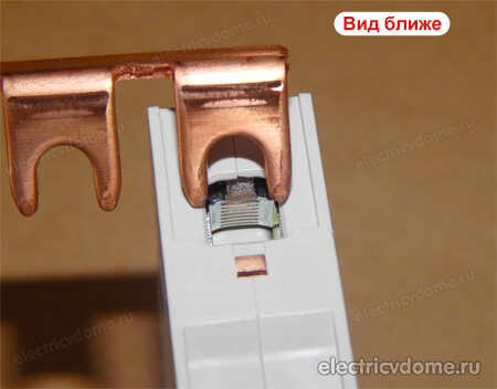 Но здесь нет ни какой магии и все довольно просто и на мой взгляд гениально придумано. На самом деле шина с вилкообразным контактом должна входить в специальный зажим на автомате (который как раз есть не на всех экземплярах).