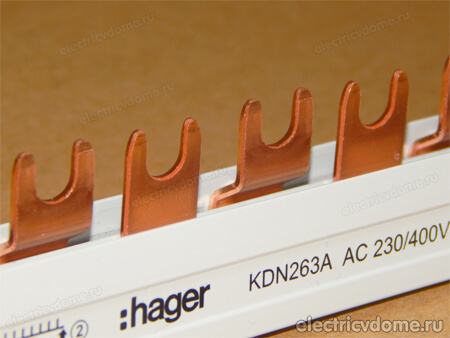 А так выглядит двухполюсная шина hager KDN263A-AC230-400V с типом контактов FORK (вилка):
