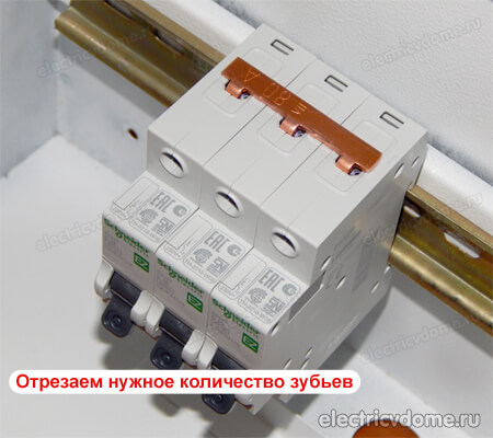 В качестве примера рассмотрим подключение автоматов фирмы Schneider Electric. Берем гребенку, вытаскиваем из нее медную шину, отрезаем три, пять, семь зубьев, в общем столько, сколько нам нужно. Затем уже по длине медной шины отрезаем пластиковый корпус с запасом так, чтобы с краёв гребёнки не торчат различные детали.