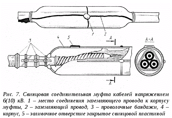 - Свинцовые муфты для стыковки кабелей, имеющих оболочки из алюминия или свинца. Достаточно громоздкие устройства выполняют из свинцовых труб диаметром 0,06 – 0,11м и длиной до 0,65 м.