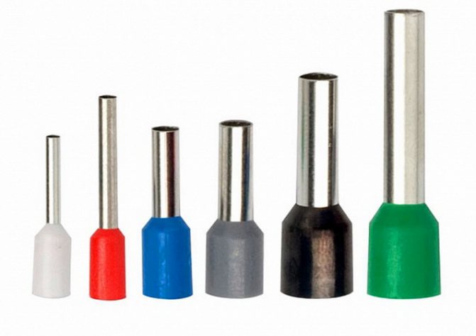 Оконцевание производится с помощью наконечников. Внешне они напоминают медные или алюминиевые колпачки. С одной стороны в них вставляется заранее зачищенный от изоляции провод, а с другой имеется отверстие для крепления под винт. Наконечник служит в качестве надежного переходника между кабелем и устройством, к которому он подключается.